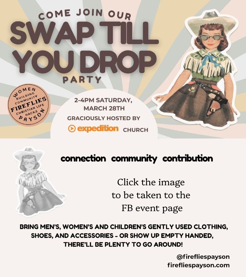 We have 2 clothing swaps a year. Spring and Fall. These are fun, free events. Whether you have something to ‘swap’ or not. Just come and shop for free and get to know us.